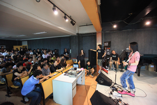 讲座现场,小林信一首先弹奏了多首由他本人编写的《地狱吉他》训练作品,他独特的演奏方式令学生耳目一新;随后,小林信一先生现场邀请了一位学生,在台上演奏了《地狱吉他》训练的最终曲目《给地狱一点爱》,并针对该学生在演奏中出现的不足加以指导,以帮助学生将更深层次地理解注入到演奏的音乐当中。小林信一先生对待音乐认真、执着的精神和追求艺术完美的态度令在场师生备受感染。讲座中小林信一一直积极与学生互动交流,学生也踊跃提问,现场气氛非常热烈。