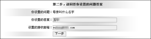 3)填入您在注册时的密码保护问题的答案,并准确填入您的电子邮箱,然后点击“下一步”。